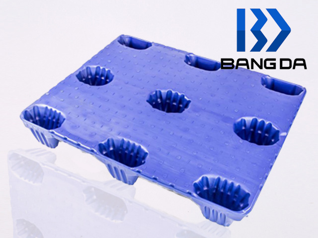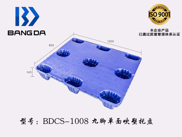 九腳塑料托盤特征 1、四面叉送料,操作簡便; 2、不適合倉庫堆放。應在各種貨架上使用,一定要注意其載重要求; 3、九腿托盤適用于各種卡車運輸,便于物料的集裝箱化、單元化運輸
