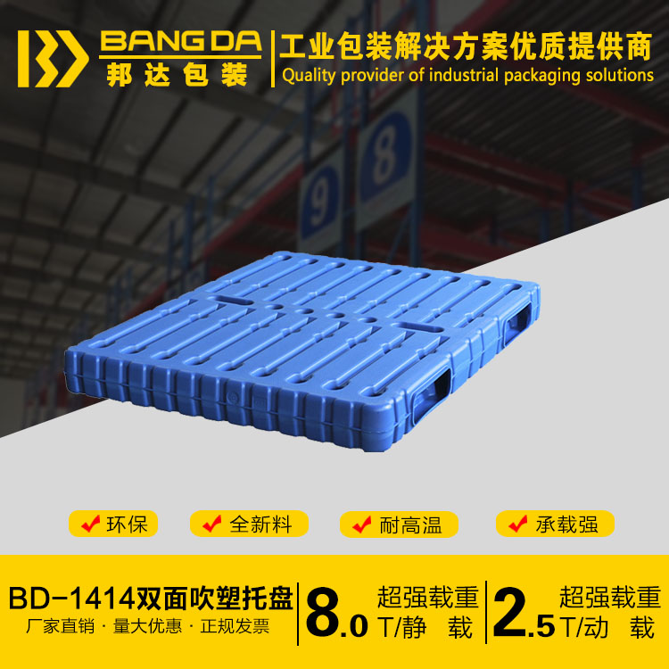 BD-1414雙面塑料托盤尺寸為1400*1400*150(mm)采用國內最先進的吹塑技術,原材料采用的是HDPE一種結晶度高,非極性的熱塑性樹脂;邦達的雙面塑料托盤承載強,耐高溫且環保;山東邦達包裝有
